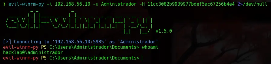 También podemos conectarnos utlizando el NT Hash del usuario Administrador usando herramientas como evil-winrm-py.