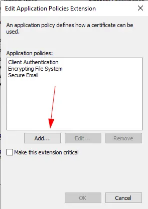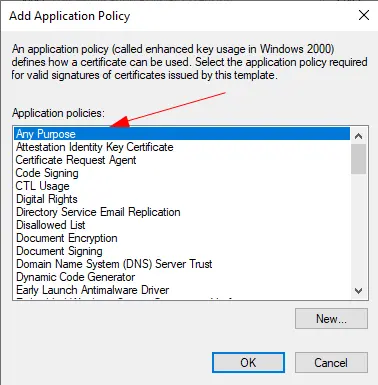 - Eliminar todas las EKU o añadir la EKU Any Purpose (