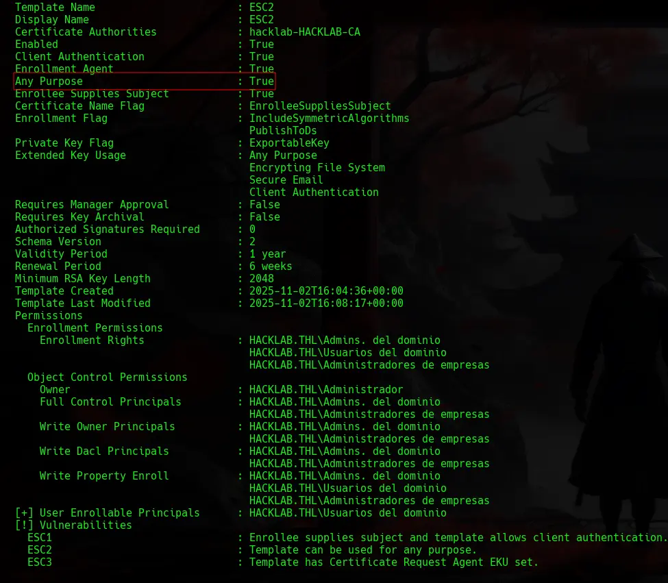 Any Purpose(OID 2.5.29.37.0) o la plantilla no define EKUs, de modo que el certificado funciona para múltiples usos (PKINIT, autenticación TLS cliente, firma, etc.). - El descriptor de seguridad (ACL) de la plantilla es demasiado permisivo, permitiendo lectura/inscripción a cuentas no privilegiadas.