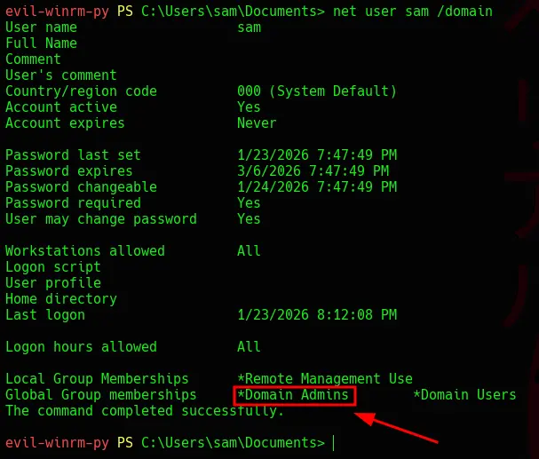 Tras aplicar la configuración, sam ahora tiene derechos de GenericWrite y AddSelf sobre el grupo Domain Admins . Por lo tanto , puede agregarse a sí mismo (o a cualquier principal que controle) al grupo.