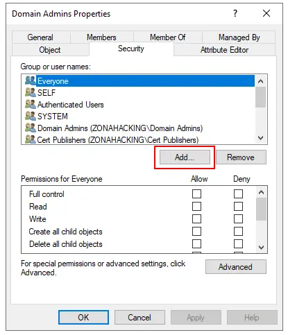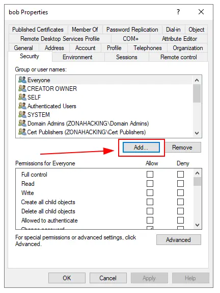 Securityhacemos clic enAdd - En el cuadro “Enter the object names to select”, escribimos joe y hacemos clic en Check Names y luego clic en