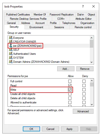 Asignamos el privilegio GeneriWrite al usuario joe sobre el usuario bob.