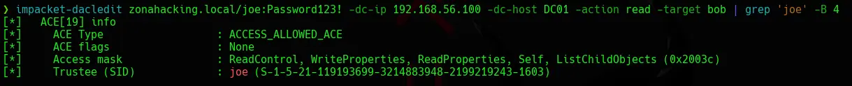 impacket-dacledit zonahacking.local/joe:Password123! -dc-ip 192.168.56.100 -dc-host DC01 -action read -target bob | grep 'joe' -B 4
