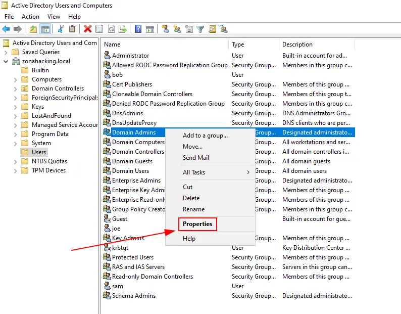 Domain Adminshaciendo clic derecho sobre el grupo.