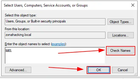 - En el cuadro “Enter the object names to select”, escribimos sam y hacemos clic en Check Name y por último hacemos clic en