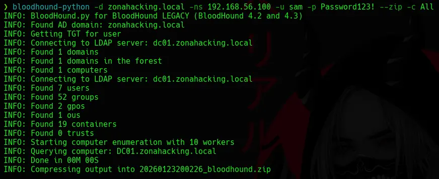 bloodhound-python -d zonahacking.local -ns 192.168.56.100 -u sam -p Password123! --zip -c All