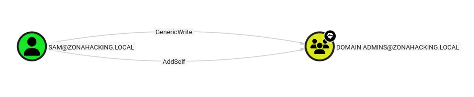 Podemos observar en el gráfico anterior, que efectivamente el usuario sam tiene los privilegios GenericWrite y AddSelf sobre el grupo Domain Admins.