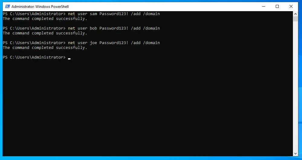 net user joe Password123! /add /domain