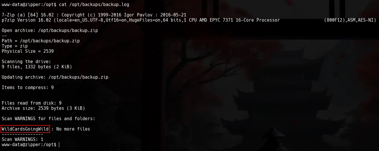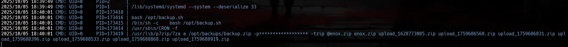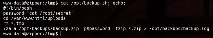 Vemos que la ejecución de la linea 7za a /opt/backups/backup.zip -p$password -tzip *.zip > /opt/backups/backup.log