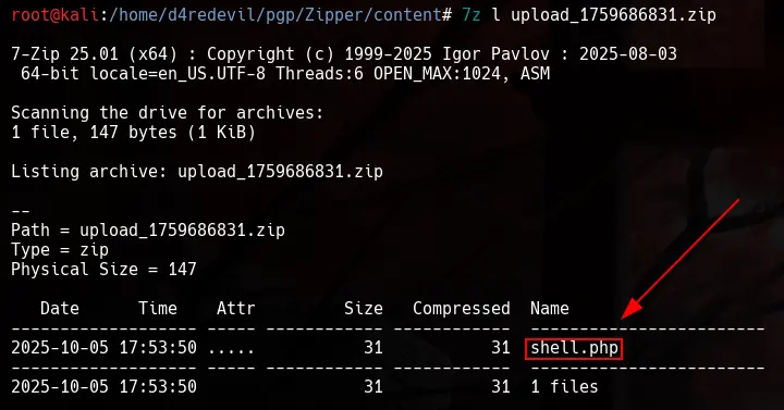 Si listamos el contenido del archivo zip, podemos observar que contiene nuestro shell.php.